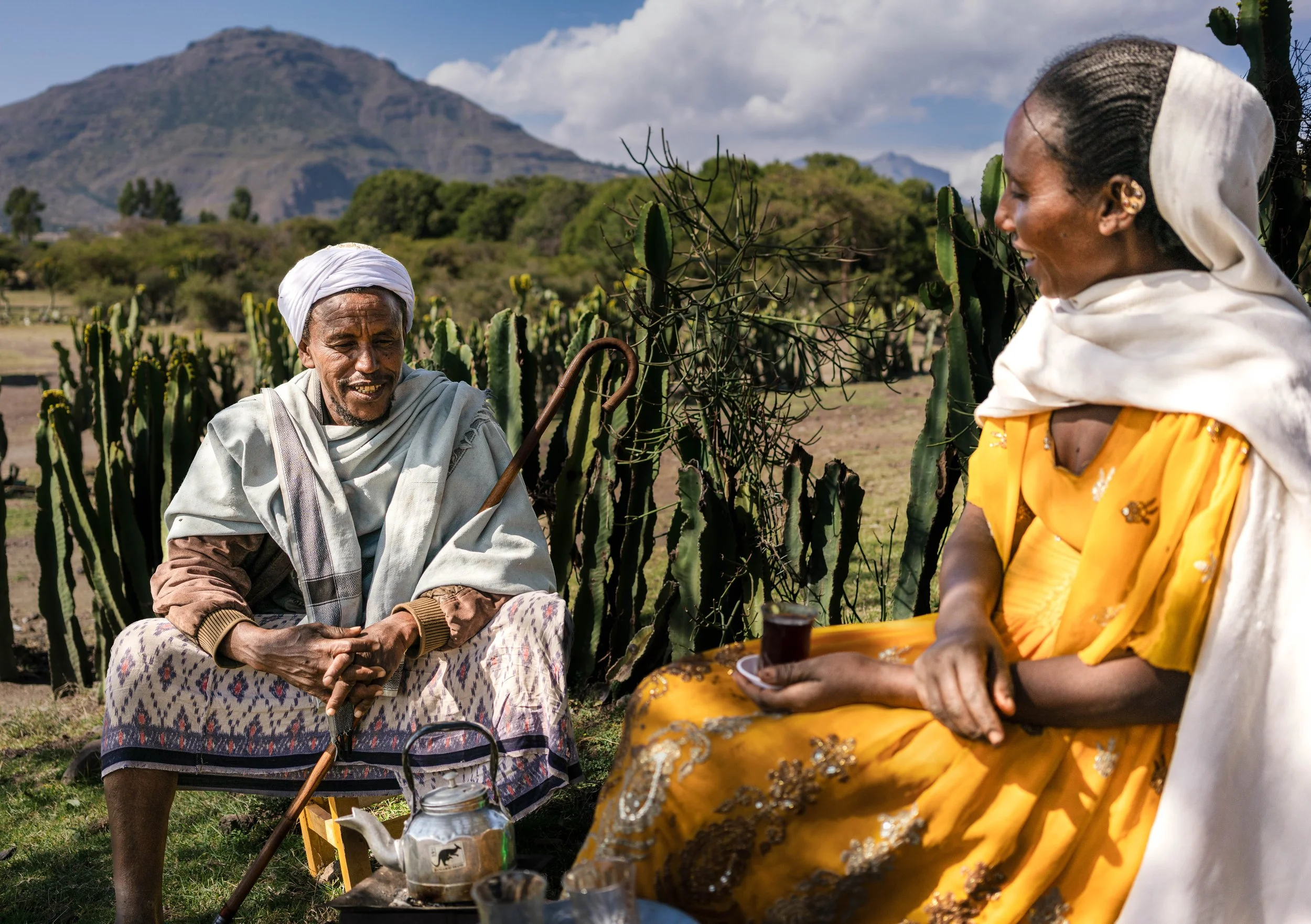Aberu meets with a village elder to discuss how their community in south Tigray, Ethiopia has strengthened resilience from the time of severe famine in the 1980s, to a more stable and food-secure community with support from donors and collaboration with the local community. Photo: Thomas Cristofoletti.